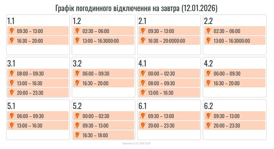Завтра, 12 січня, в усіх регіонах України, в тому числі на Прикарпатті, будуть застосовуватися графіки погодинних вимкнень.