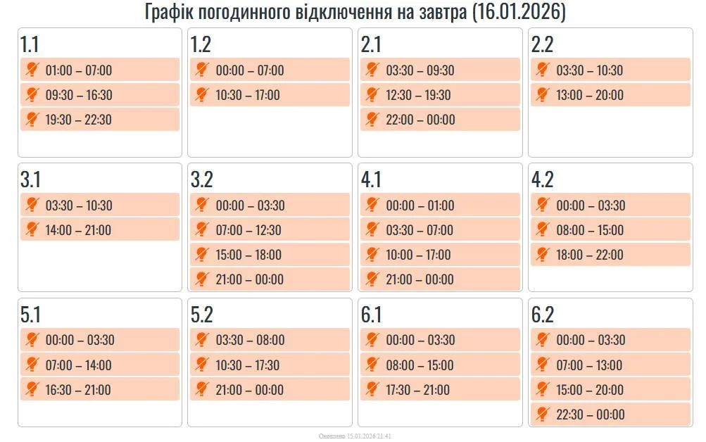 Завтра, 16 січня, в усіх регіонах України, в тому числі на Прикарпатті, будуть застосовуватися графіки погодинних вимкнень.