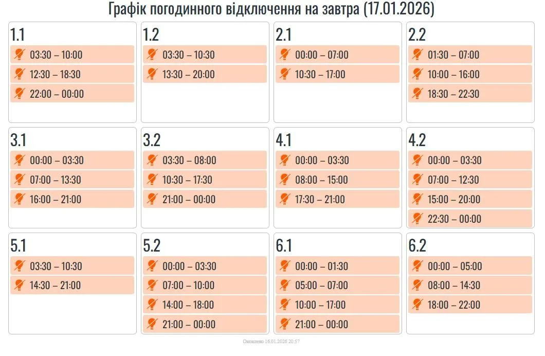 Завтра, 17 січня, в усіх регіонах України, в тому числі на Прикарпатті, будуть застосовуватися графіки погодинних вимкнень.