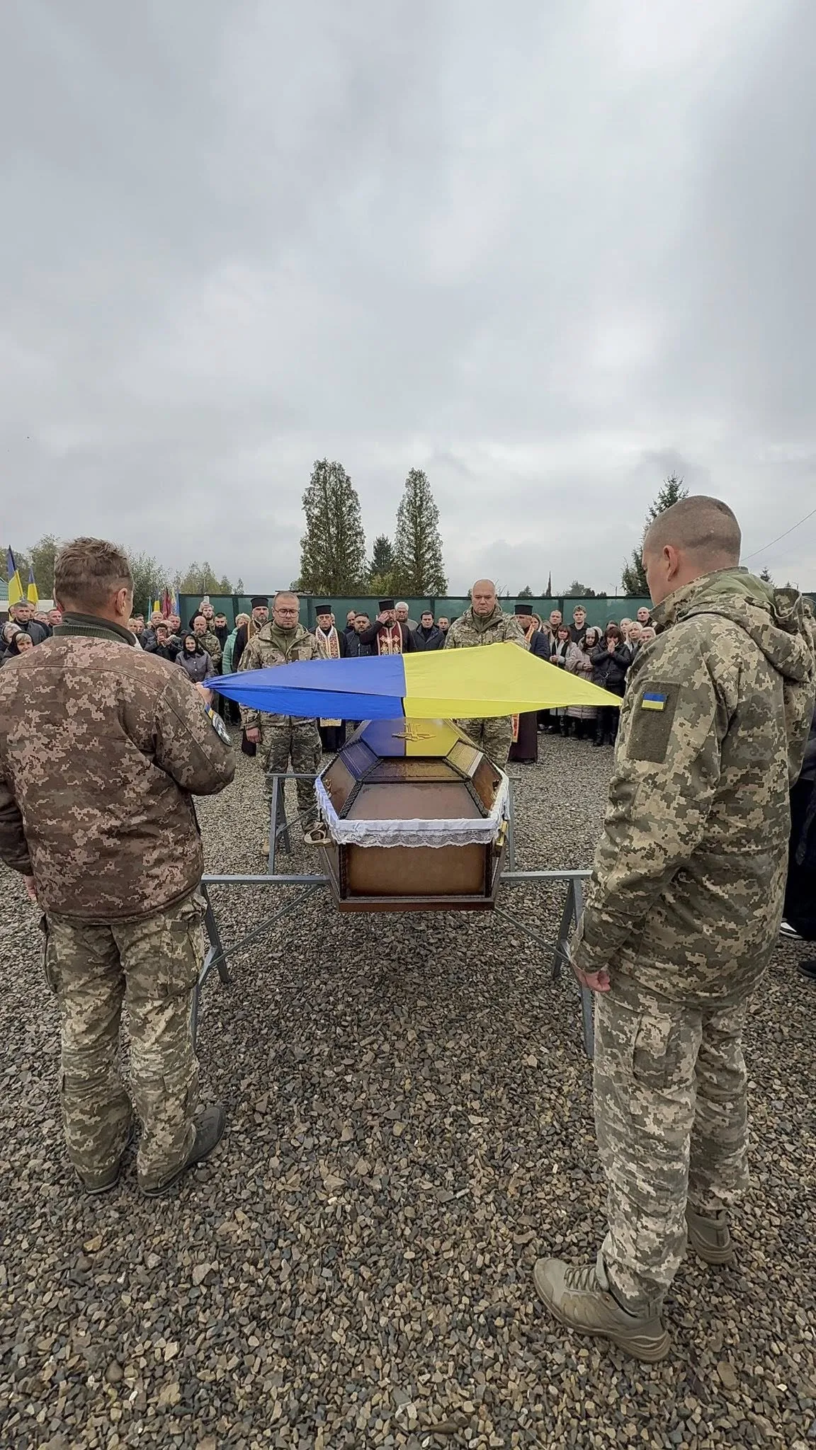 У міському Будинку смутку відбулося загальноміське прощання — зібралися побратими, колеги з Національної поліції, військовослужбовці, представники влади, духовенство, мешканці міста, щоб віддати шану тому, хто до останнього подиху стояв за Україну.