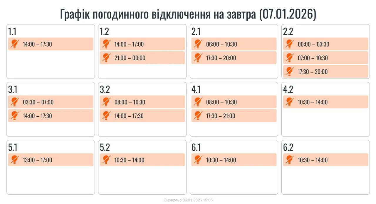 Завтра, 7 січня, в усіх регіонах України, в тому числі на Прикарпатті, будуть застосовуватися графіки погодинних вимкнень.