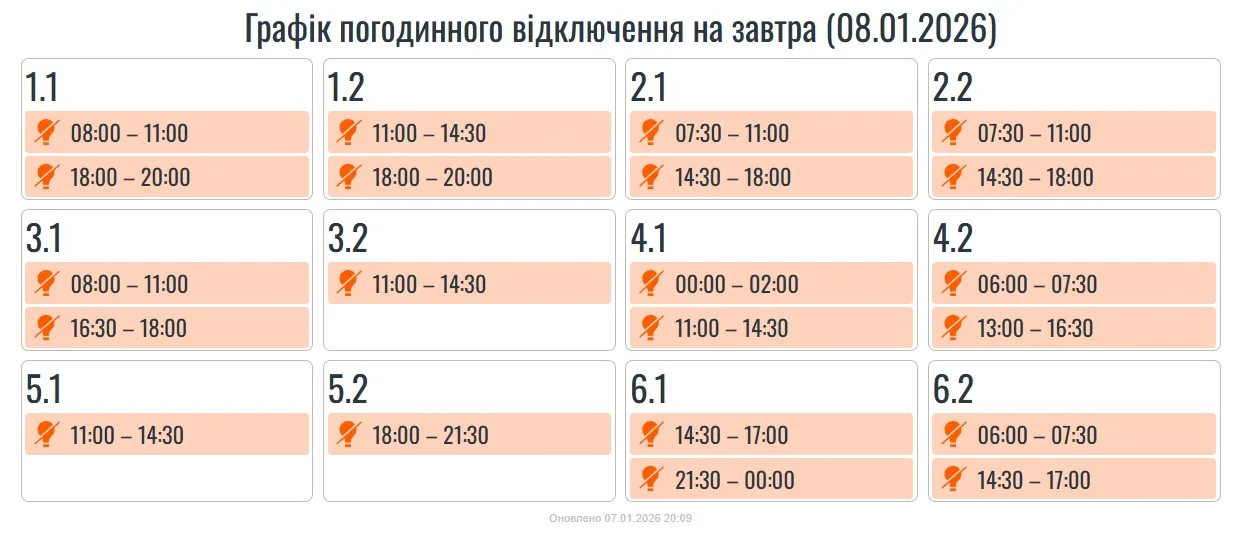 Завтра, 8 січня, в усіх регіонах України, в тому числі на Прикарпатті, будуть застосовуватися графіки погодинних вимкнень.
