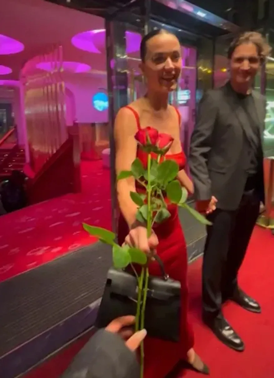 Перрі була одягнена в яскраво-червону сукню, тоді як політик мав невимушено стильний вигляд у повністю чорному одязі. До слова, один із шанувальників подарував Кеті троянду та привітав її з днем народження.