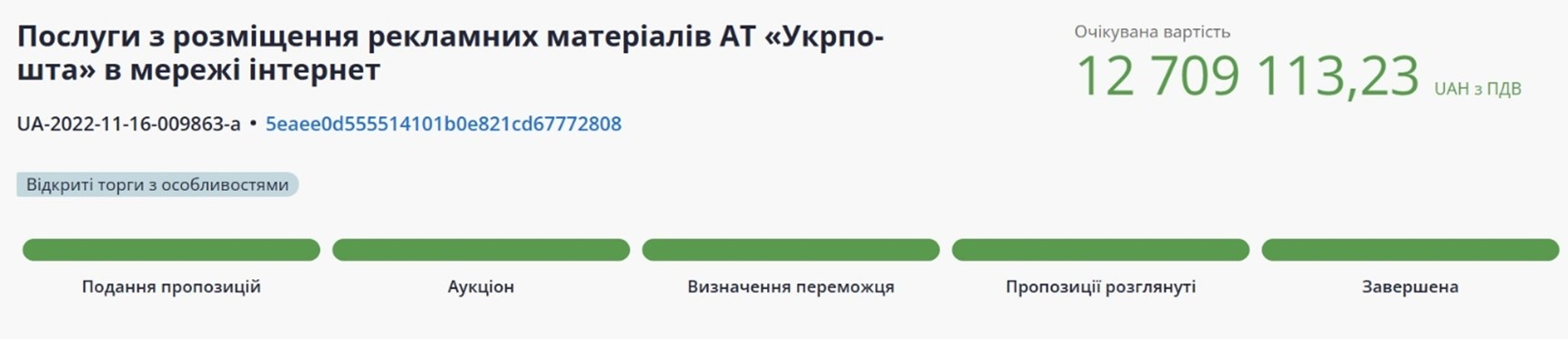 Улітку 2022 року АТ «Укрпошта» провела масштабний тендер на послуги з проведення рекламних кампаній. За умовами конкурсу, підрядник мав підготувати майже 900 різних рекламних матеріалів. А також забезпечити, що цю рекламу переглянуть 311 млн разів і 3 млн людей клікнуть по ній. Крім цього, щоб майже 1,5 млн людей подивилися відеорекламу, а 27,5 тис. – завантажили мобільний застосунок «Укрпошти».
