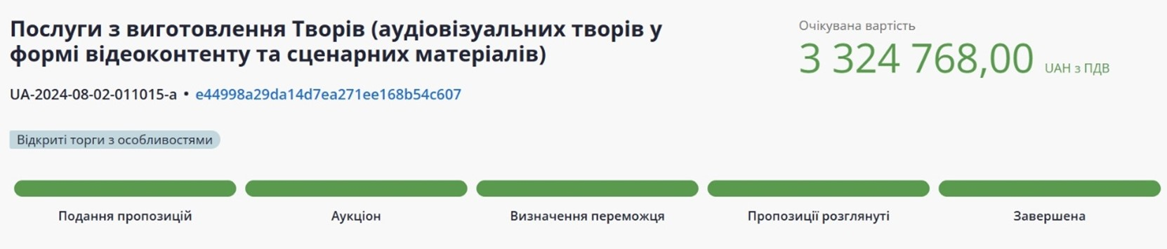 Очікувана вартість послуг склала понад 12,5 млн грн. Переміг у торгах єдиний учасник – вище згадане ТОВ «Мікс Діджитал». Компанія запропонувала невеличку знижку, а саме 370 тис. грн.