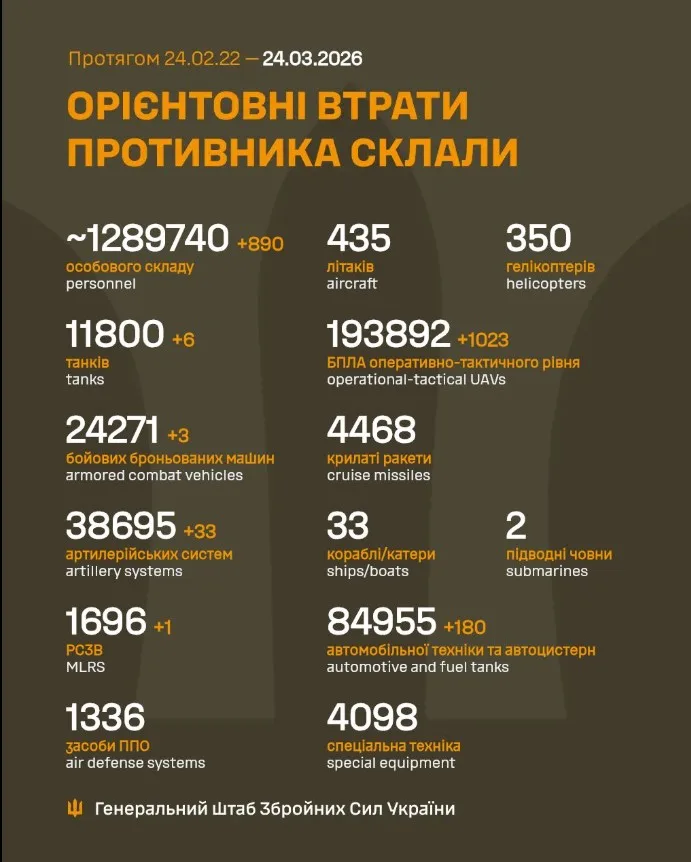 Як повідомляє Генеральний штаб Збройних Сил України, загальні бойові втрати противника з 24.02.22 по 24.03.26 орієнтовно склали / The estimated total combat losses of the enemy from 24.02.22 to 24.03.26.