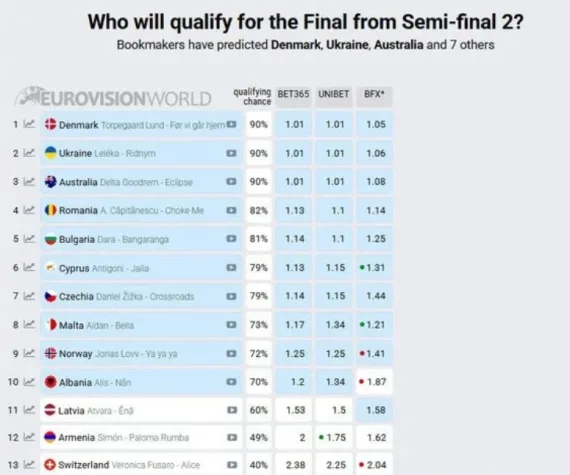 Крім того, вихід до фіналу пророкують Данії, Австралії, Румунії, Болгарії, Кіпру, Чехії, Мальті, Норвегії та Албанії.
