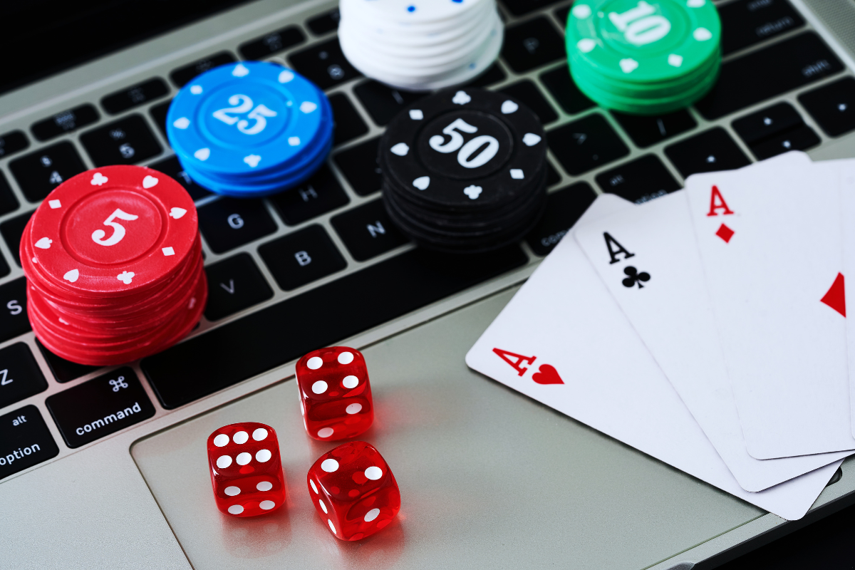 Покерні фішки і карти на клавіатурі ноутбука