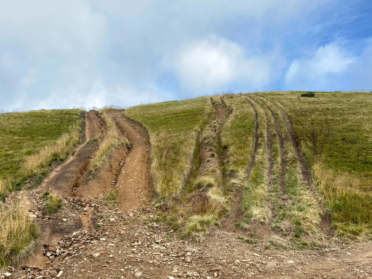 - Руйнування ґрунтів (ерозія) і ландшафтів. Колеса позашляховиків, квадроциклів та багі механічно знищують верхній шар ґрунту і рослинність. Саме коріння трав і чагарників утримує землю на схилах. Без цієї рослинності весняні талі води і дощі безперешкодно вимивають ґрунт, запускаючи процес ерозії. На схилах з’являються глибокі яруги, які поступово перетворюються на нові русла для води. А коли стара колія стає непроїзною, водії прокладають нову поруч – так зона руйнування невпинно розширюється.