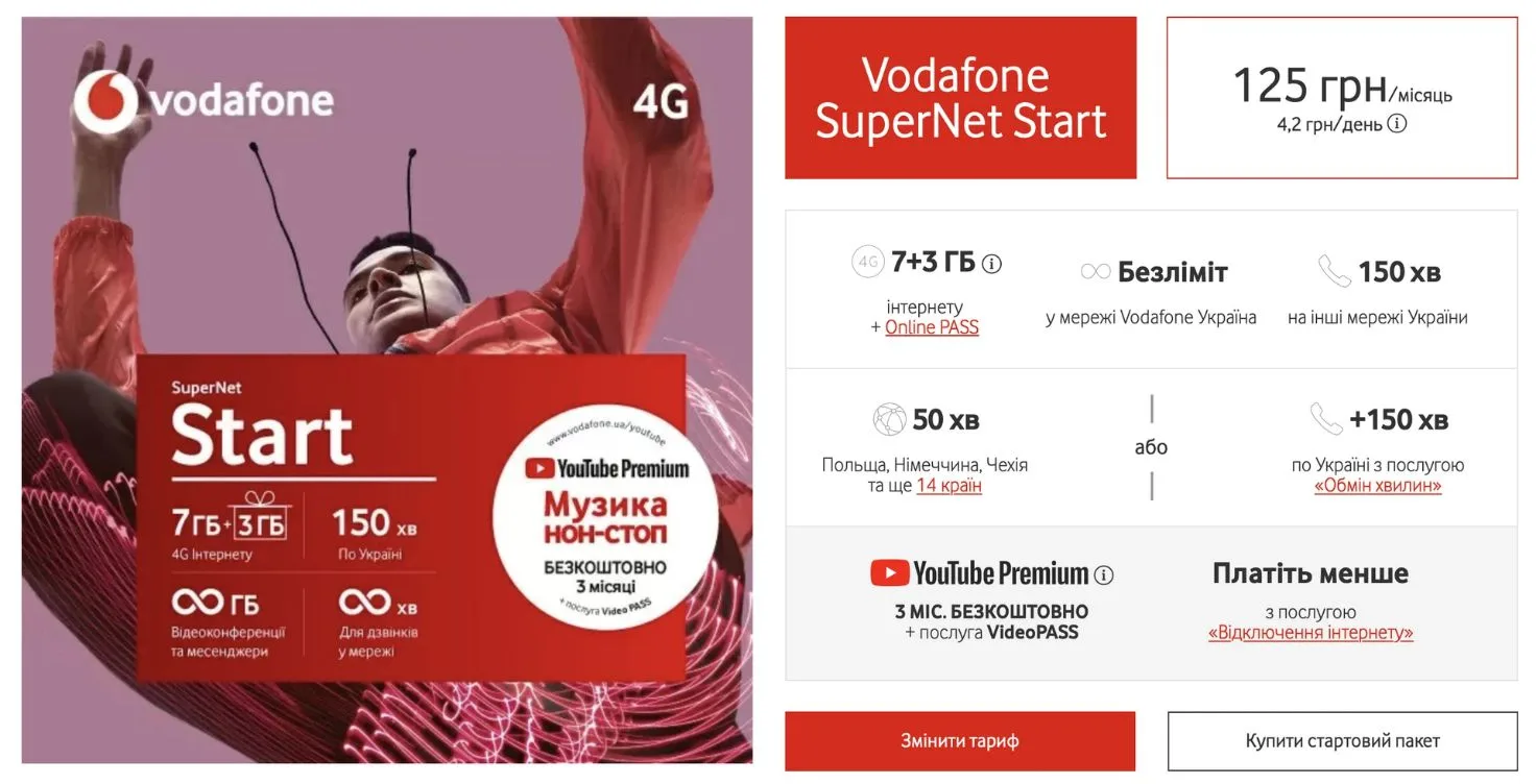 Чотири роки тому тарифи Vodafone Україна були теж були суттєво нижчими: стартовий пакет SuperNet Start коштував 125 грн на місяць. За ці гроші абонент отримував 7 ГБ інтернету (згодом +3 ГБ бонусом), безліміт у мережі, 150 хвилин на інші оператори та ще 50 хвилин на міжнародні дзвінки.