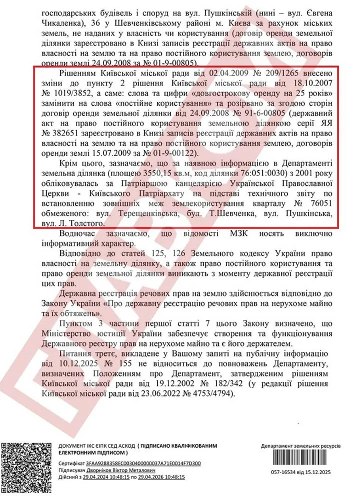 Як з’ясував «Главком», земельна ділянка площею 35 соток на столичній вулиці Чикаленка, 36 (Патріарша резиденція), яка з початку нульових перебувала у постійному користуванні Київської патріархії УПЦ КП, з травня 2020-го також змінила користувача. Ним стала Православна церква України.