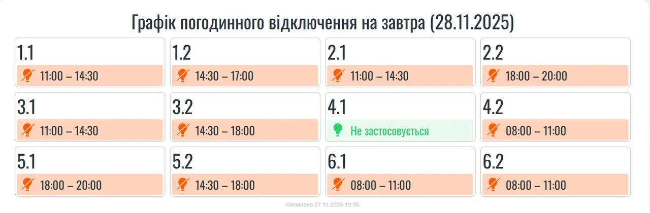 Завтра, 28 листопада, протягом доби на Франківщині будуть застосовуватися графіки погодинних вимкнень.