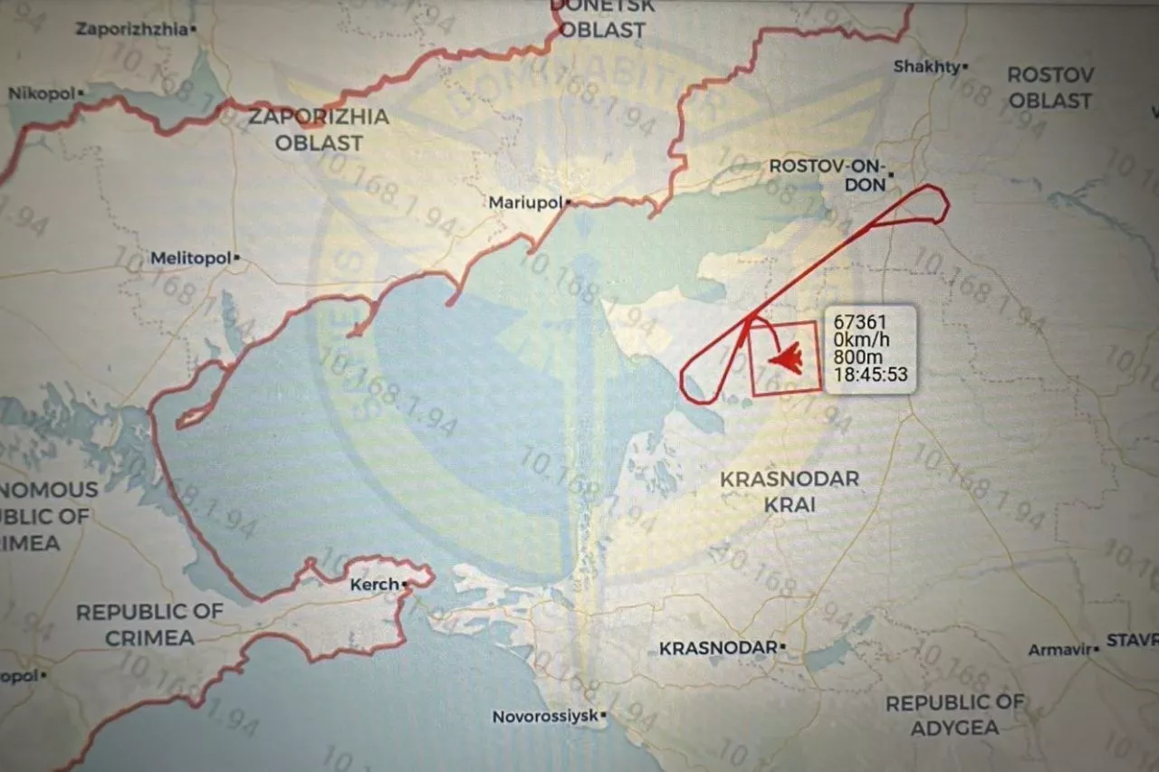 Повідомляється, що різке падіння швидкості та висоти підбитого літака А-50У зафіксовано поблизу міста Єйськ.