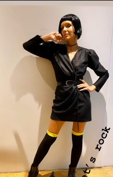 Відповідні фото пара показала в InstaStories. У новому амплуа теледіву просто не впізнати! Вона вбралася в коротке плаття з люрексом і широким шкіряним поясом, доповнила зухвалий образ гетрами і масивними черевиками, а в якості прикраси вибрала чокер.