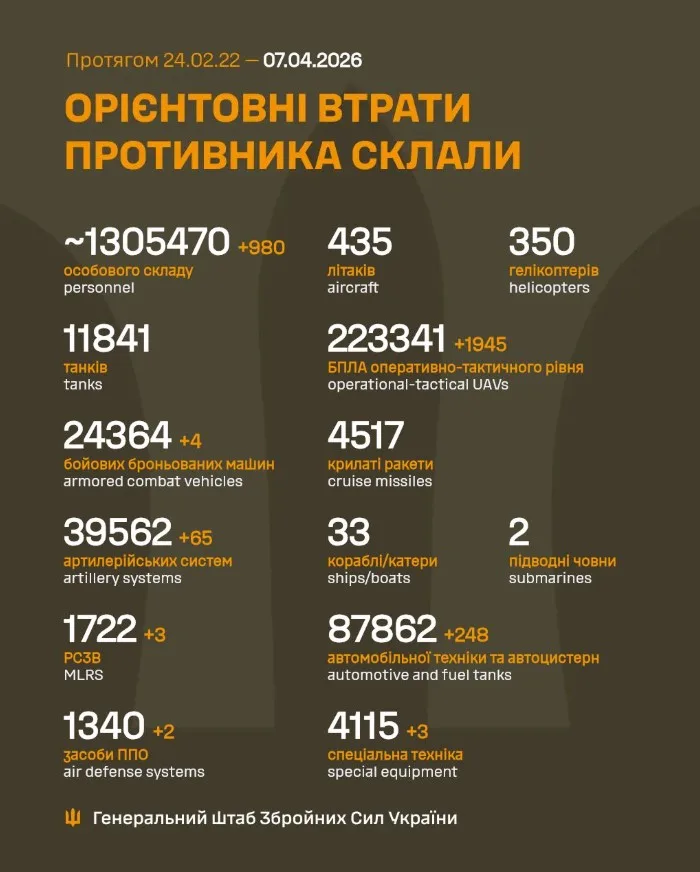 Як повідомляє Генеральний штаб Збройних Сил України, Загальні бойові втрати противника з 24.02.22 по 07.04.26 орієнтовно склали / The estimated total combat losses of the enemy from 24.02.22 to 07.04.26