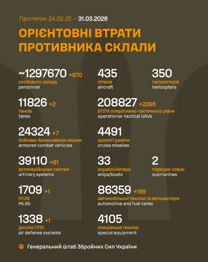 Як повідомляє Генеральний штаб Збройних Сил України, загальні бойові втрати противника з 24.02.22 по 31.03.26 орієнтовно склали / The estimated total combat losses of the enemy from 24.02.22 to 31.03.26