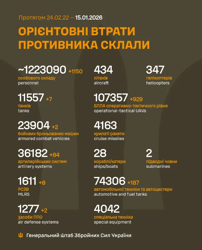 Як повідомляє Генеральний штаб Збройних Сил України, Загальні бойові втрати противника з 24.02.22 по 15.01.26 орієнтовно склали / The estimated total combat losses of the enemy from 24.02.22 to 15.01.26.