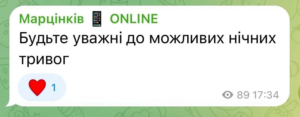 “Будьте уважні до можливих нічних тривог”, – написав Марцінків.