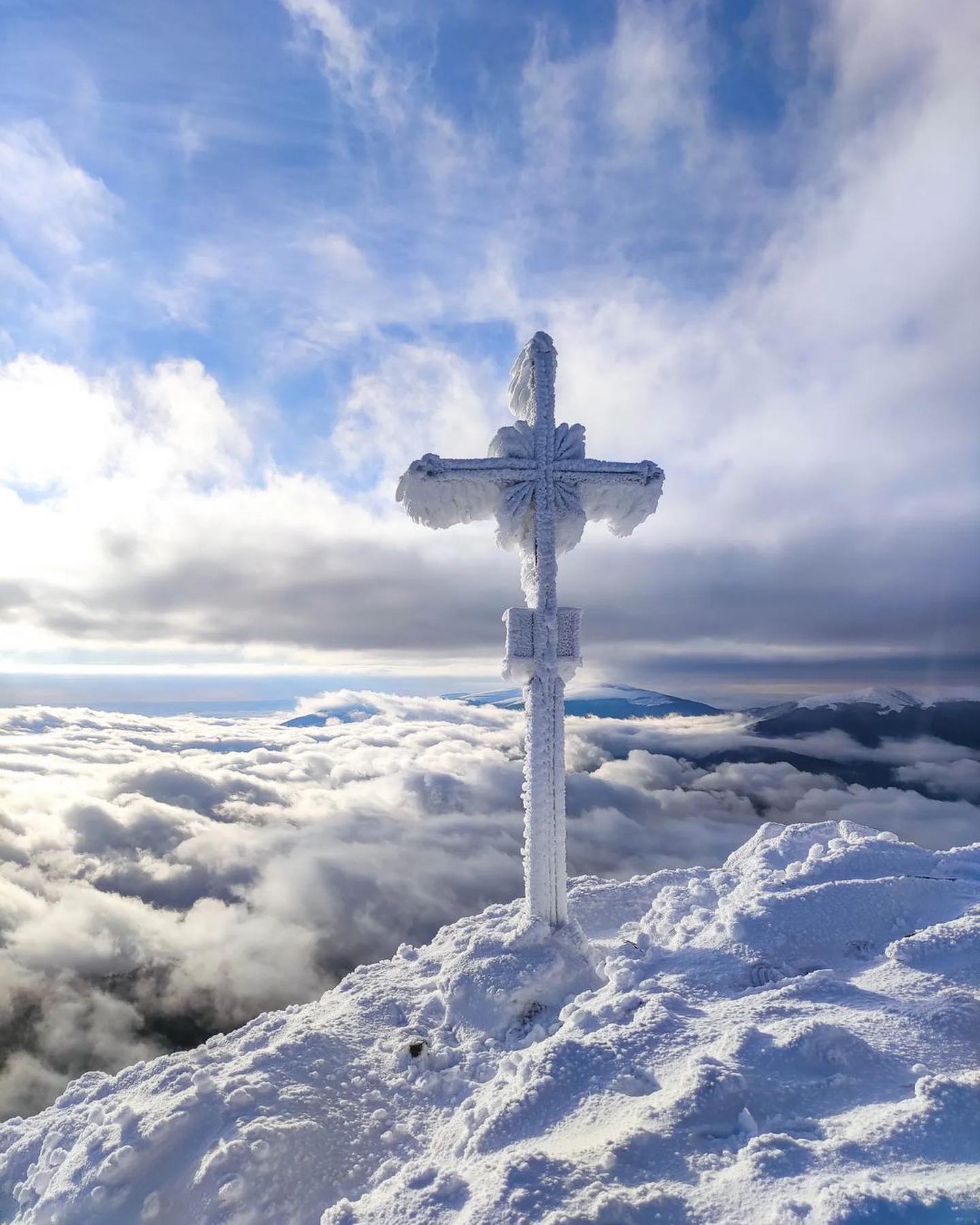 Українські соцмережі підкорили фото засніженої найвищої вершини Львівщини. Найбільше вражає знімок замерзлої й вкритої інеєм статуї Ісуса Христа, яка встановлена на горі Пікуй.