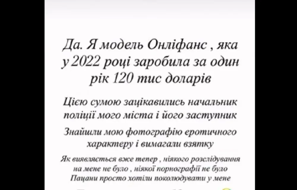 “Я модель Онліфанс, яка у 2022 році заробила за один рік 120 тис. доларів. Цією сумою зацікавились начальник поліції мого міста і його заступник. Знайшли мою фотографію еротичного характеру і вимагали взятку”, – розповіла модель.