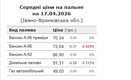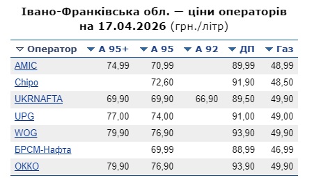 Дані щоденного моніторингу бензину А-95 також свідчать, що 17 квітня середня ціна зменшилася до 73,01 грн/л після 73,12 грн/л днем раніше. Це означає добове зниження на 11 копійок, що відповідає загальній тенденції до поступового охолодження роздрібного сегмента.