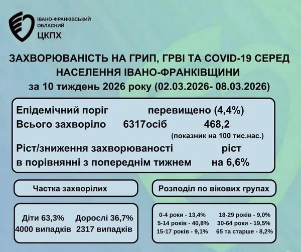 За результатами аналізу захворюваності впродовж десятого тижня 2026 року (епідсезон 2025–2026 рр.) на ГРВІ, грип та COVID-19 захворіли 6317 осіб, з них 4000 дітей віком 0–17 років, що становить 63,3% від усіх хворих.