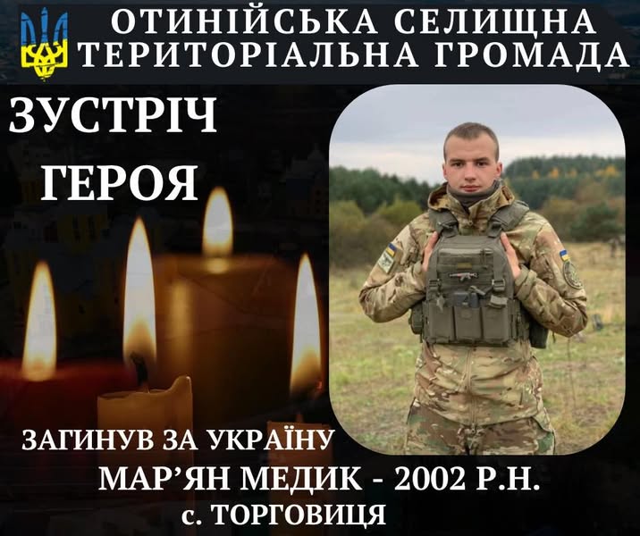 “З глибоким сумом сповіщаємо, що в боях за свободу та незалежність України загинув молодий воїн, наш земляк — Медик Марʼян Михайлович, 20.09.2002 р.н.