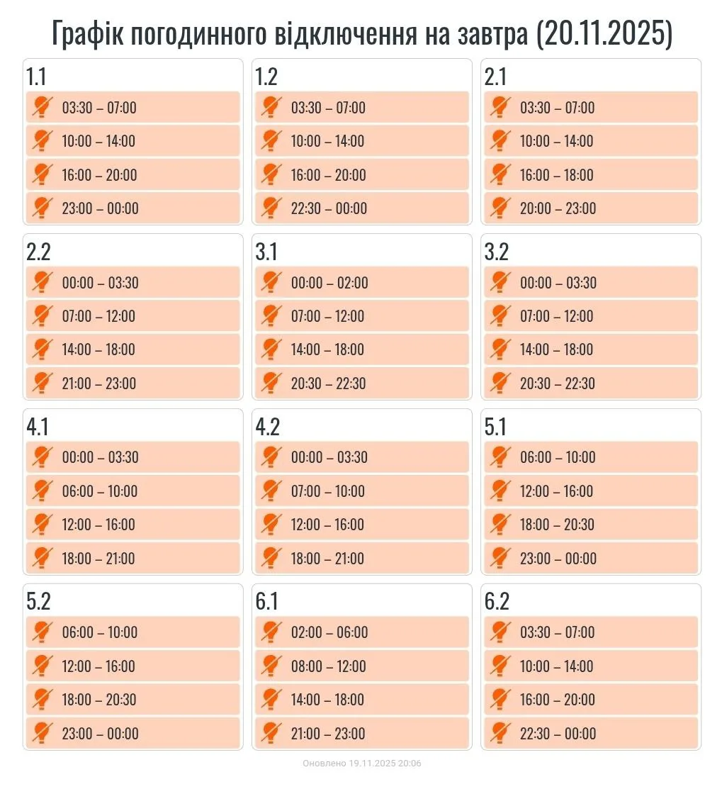 Завтра, 20 листопада, для побутових споживачів графіки погодинних вимкнень будуть діяти з 00:00 до 23:59 – обсягом від 2,5 до 4 черг.