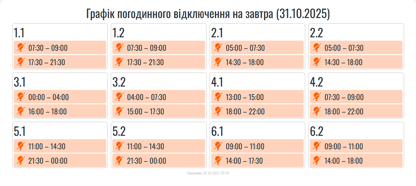 - Графіки погодинних вимкнень (ГПВ) для побутових споживачів — також з 00:00 до 24:00, обсягом від 0,5 до 3 черг.