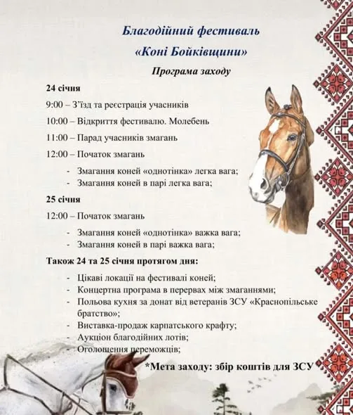 У селі Пороги 24–25 січня відбудеться благодійний фестиваль “Коні Бойківщини”, метою якого є збір коштів на підтримку Збройних сил України.