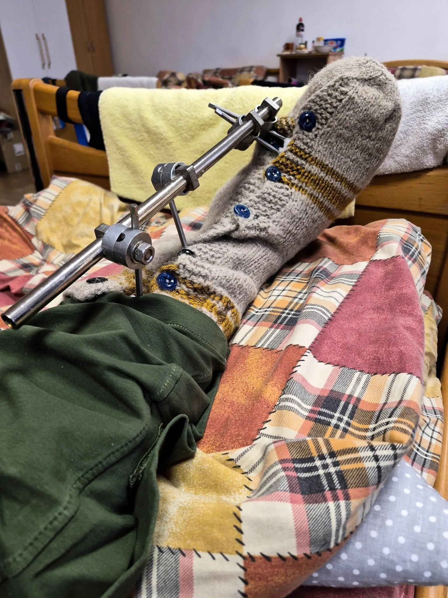 Залишається сильна контрактура правої ноги та ослаблені м’язи після тривалого лежання. Реабілітацію проходить двічі на день: розробляють коліно, проводять фізичні вправи та електростимуляцію м’язів.