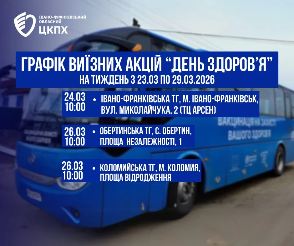 З 23 по 29 березня 2026 року в громадах Івано-Франківської області триватимуть виїзні акції «День здоров’я». Фахівці Центру разом із медиками закладів охорони здоров’я продовжать надавати мешканцям безкоштовні медичні послуги та психологічну підтримку.