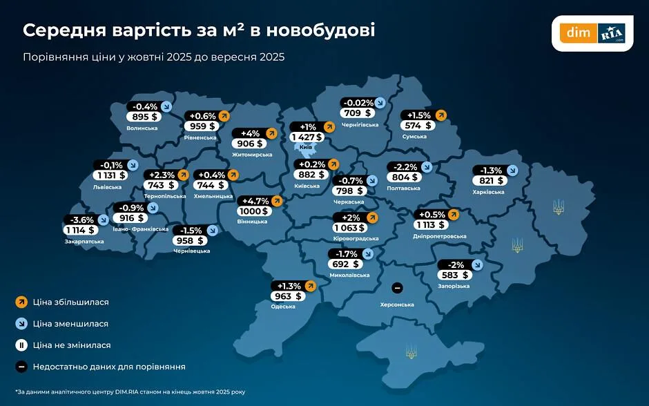 У жовтні 2025 року середня ціна квадратного метра в новобудовах Івано-Франківської області становить $916. Попит на житло стабільний, пропозиція дещо збільшилася.