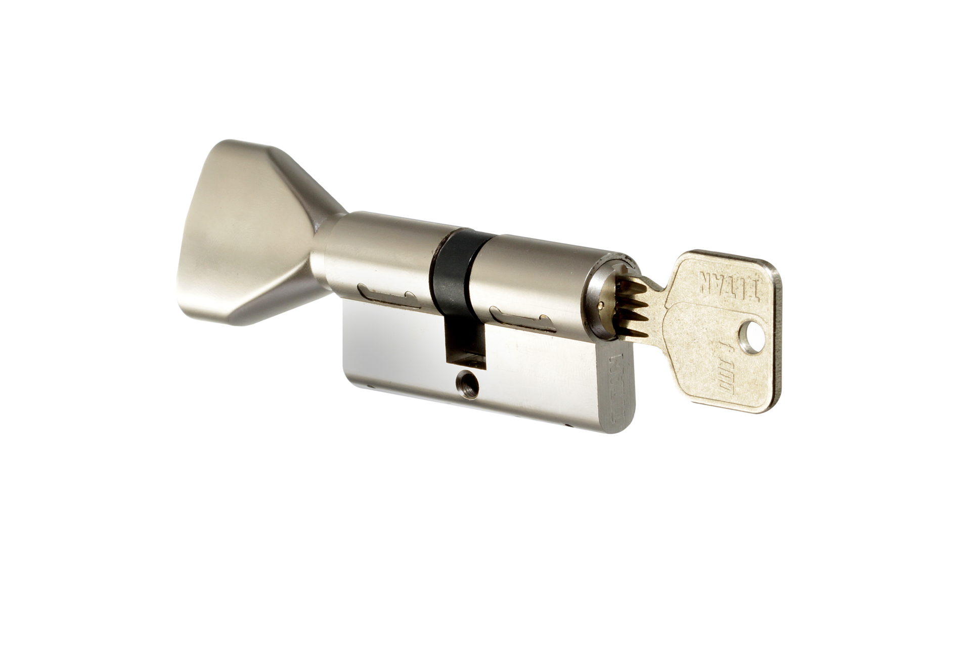- Цилиндровый. Это классика, которая очень широко распространилась благодаря своей долговечности. Принцип действия такой: когда ключ с определенной нарезкой вставляется в скважину, то штифты секрета принимают такое положение, когда замок можно провернуть. Язычок замка перемещается и фиксируется. Главное преимущество такого замка – тот факт, что к нему тяжело подобрать отмычку. Секретный шифр очень надежный.