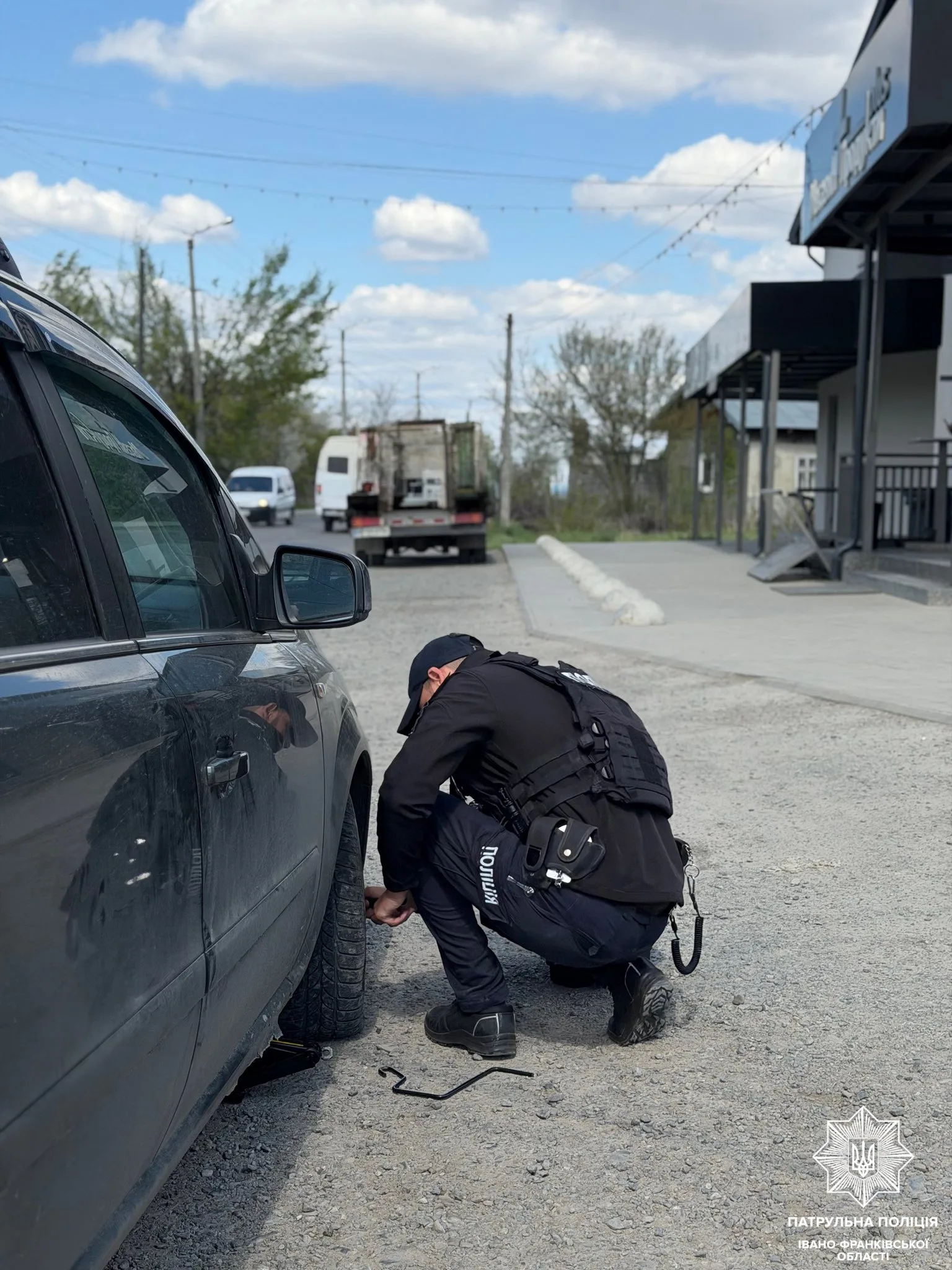 Поліцейські зупинилися, аби з’ясувати, чи потрібна допомога. Водійка пояснила, що не може самостійно замінити колесо, оскільки воно було повністю пошкоджене, пише Патрульна поліція Івано-Франківської області.