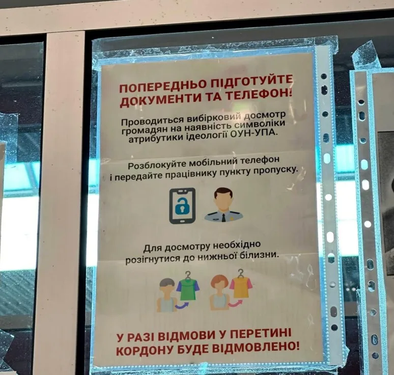 Влітку низка російських телеграм-каналів лякала фото оголошення, яке нібито висить на вході до Контрольно-пропускного пункту (КПП) на польсько-українському кордоні. У ньому йдеться, що перед перетином в українців роздягатимуть до білизни і перевірятимуть, чи набили вони бандерівські татуювання. А також буцімто шукатимуть символіку УПА в телефонах.