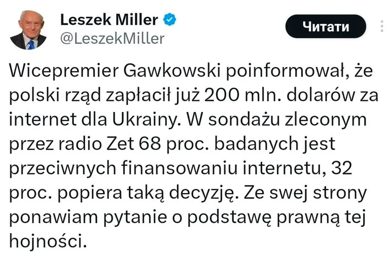 З його останніх маніпулятивних «гріхів»: 68% поляків виступають проти того, що польський уряд фінансує придбання терміналів Starlink для України. Але ж екскомуніст Міллер зманіпулював, бо назвав «соціологічним опитуванням» нерепрезентативне онлайн-голосування під час ефіру на сайті Radio Zet. Таке опитування не відображає реальної громадської думки, адже будь-хто міг проголосувати і зробити це кілька разів. Та кому у тих дефініціях і статистиках цікаво розбиратися?