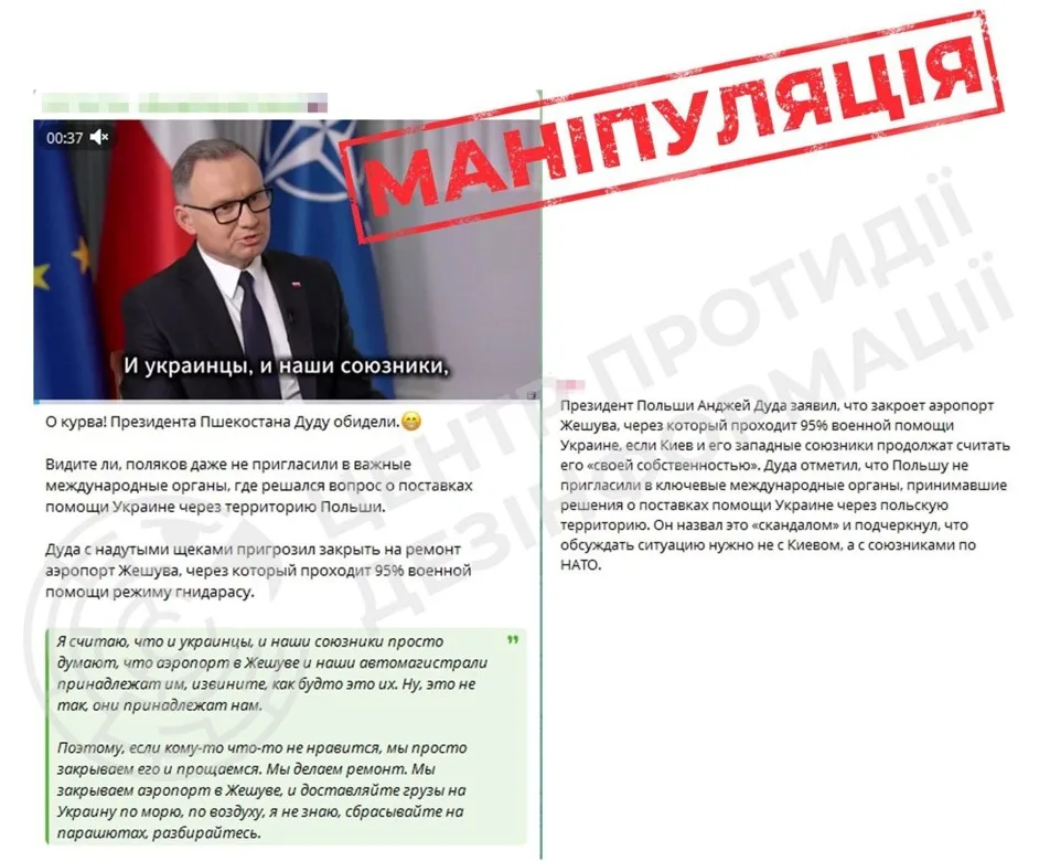 По вже експрезиденту Анджею Дуді російська пропагандистська машина не раз проходилася катком. Торік вона розповсюдила фейк про те, що Варшава планує закрити аеропорт у Жешуві, через який проходить більшість західної допомоги Україні. У деяких повідомленнях писали навіть про «погрози припинити допомогу Україні». Насправді ж на той момент президент Дуда закривати нічого не збирався, а в інтерв’ю згадував гіпотетичні можливості, які могли бути використані, щоб продемонструвати важливість Польщі як транзитної країни. Але ж кремлівський наратив про те, що поляки втомилися нам допомагати, сам себе не розкрутить.