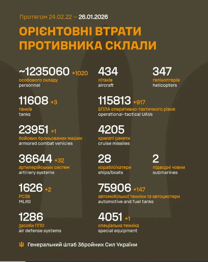 Як повідомляє Генеральний штаб Збройних Сил України, загальні бойові втрати противника з 24.02.22 по 26.01.26 орієнтовно склали / The estimated total combat losses of the enemy from 24.02.22 to 26.01.26.