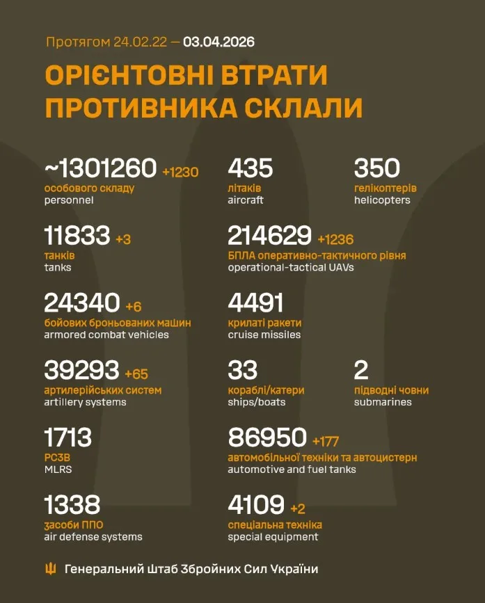 Як повідомляє Генеральний штаб Збройних Сил України, загальні бойові втрати противника з 24.02.22 по 03.04.26 орієнтовно склали / The estimated total combat losses of the enemy from 24.02.22 to 03.04.26
