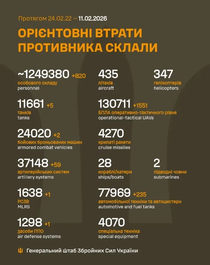 Як повідомляє Генеральний штаб Збройних Сил України, загальні бойові втрати противника з 24.02.22 по 11.02.26 орієнтовно склали / The estimated total combat losses of the enemy from 24.02.22 to 11.02.26.