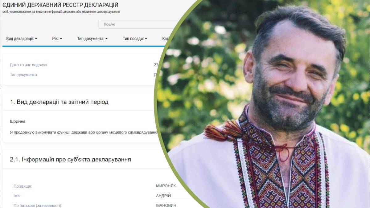 Крім заробітної плати, 51-річний Андрій Мироняк у декларації зазначив пенсію у розмірі 135 тис. гривень, яку отримав за службу в органах внутрішніх справ та службу на різних посадах у військових структурах.