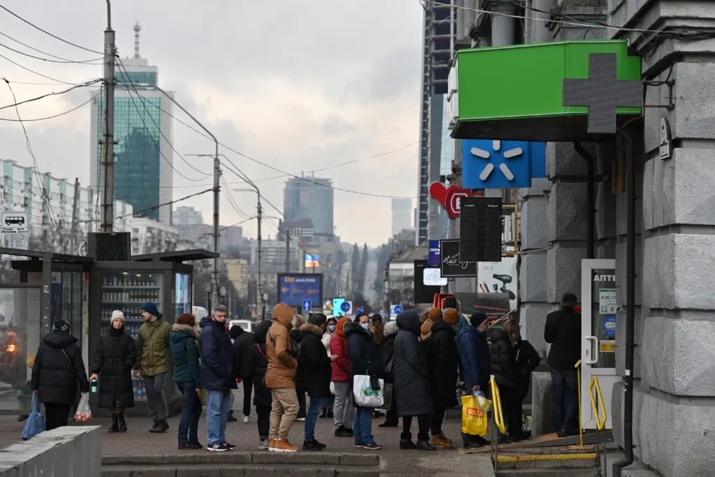 Люди стоять у черзі до аптеки в Києві 24 лютого 2022 року