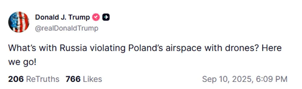 Трампа вистачило лише на неоднозначний допис в Х: «Що це за порушення Росією повітряного простору Польщі за допомогою дронів? Почалося!». Згодом, щоправда, він домовився про зустріч із президентом Польщі Каролем Навроцьким. Тепер бачимо, що вона нічого не змінила.