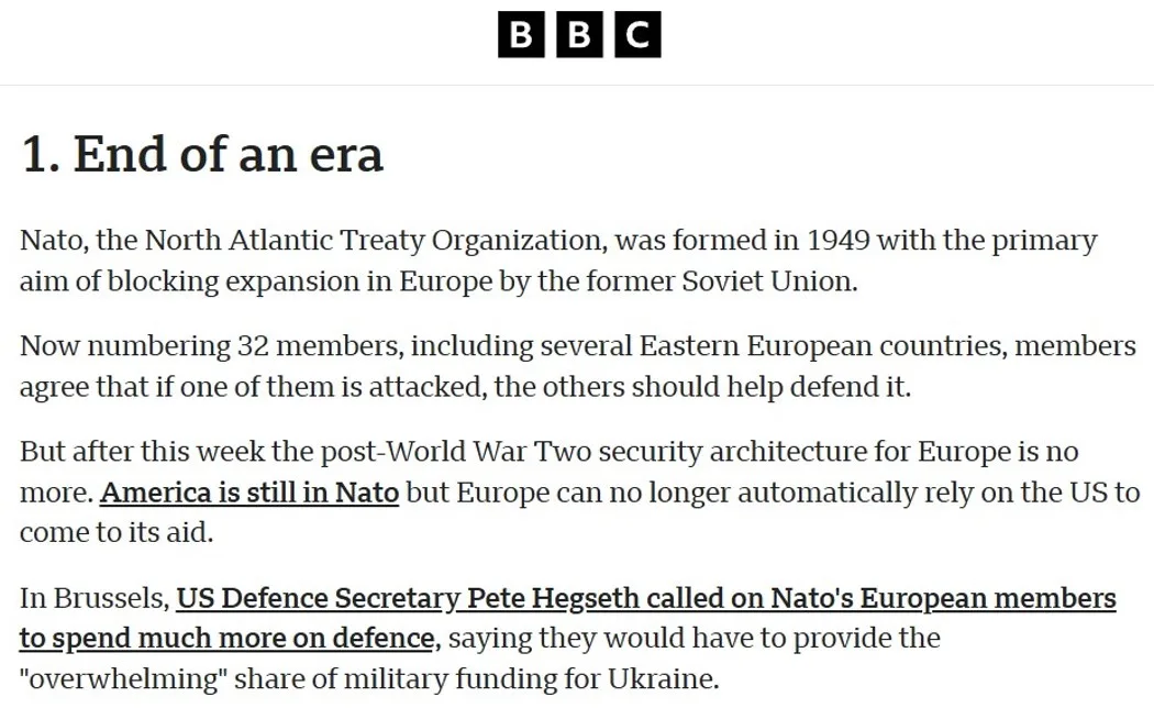 Ще більшою проблемою, ніж нерішучість НАТО, є розлад всередині Альянсу. Найбільший інвестор оборонного союзу США ставить ультиматум решті членів. Після Мюнхенської конференції з безпеки у 2025 році видання ВВС висловилось лаконічно: «Кінець епохи».