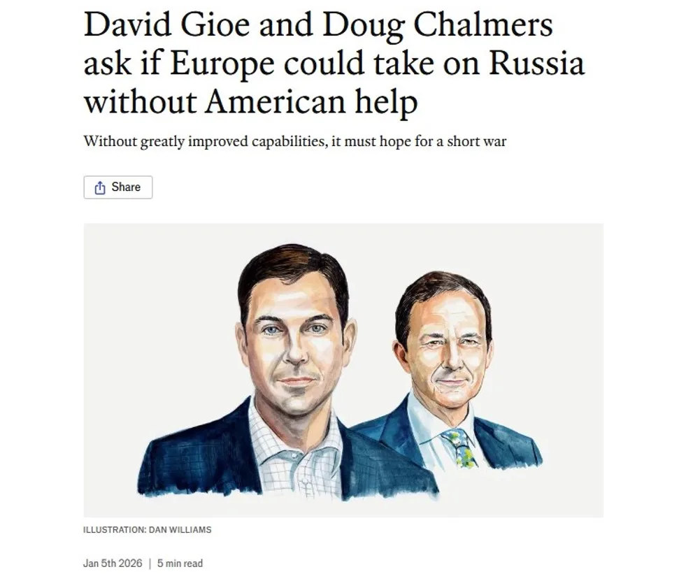 Песимістичний для Європи прогноз The New York Times – не єдиний. Професор кафедри воєнних досліджень Королівського коледжу Лондона, академічний директор Кембриджської ініціативи з безпеки Девід Джіо та ексзаступник начальника штабу оборони Великої Британії, викладач коледжу Еммануеля Кембриджського університету Даг Чалмерс на сторінках The Economist 5 січня 2026 року поділилися своїми прогнозами щодо того, чи зможе вистояти Європа проти РФ.