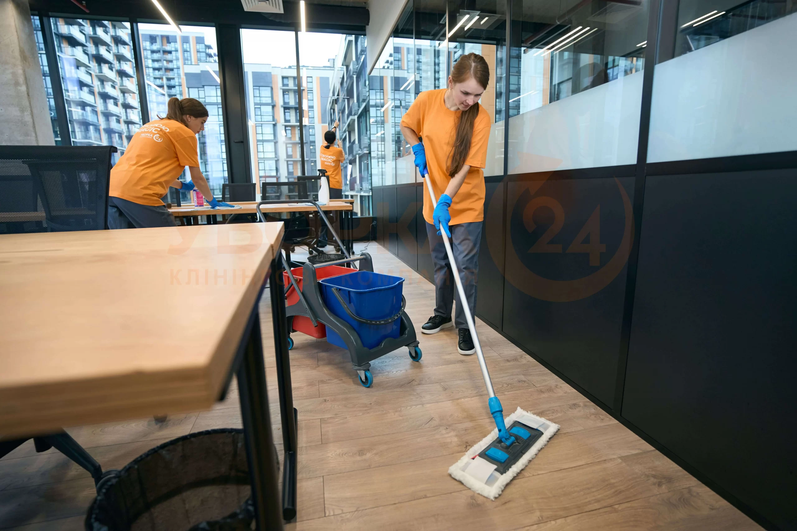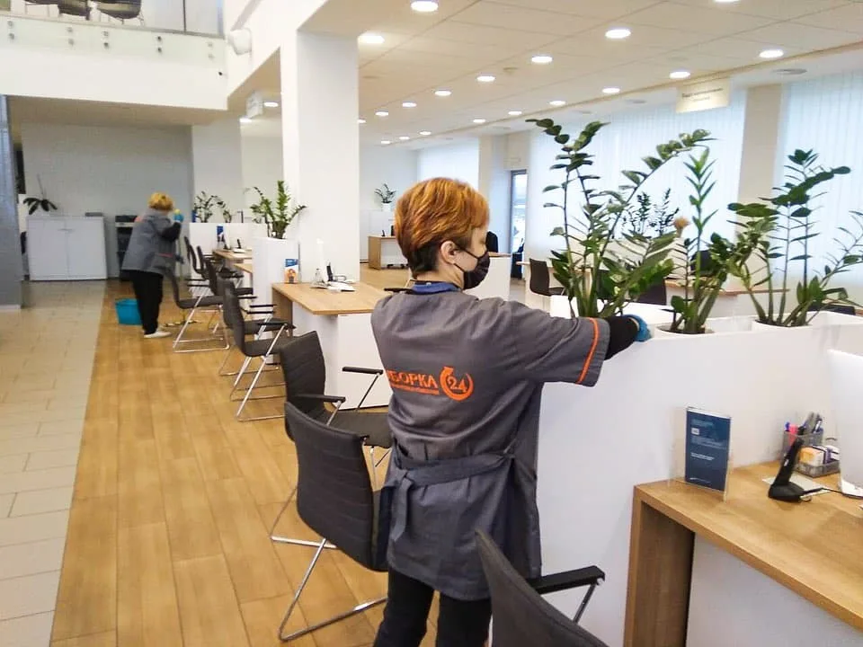 До переліку робіт входить прибирання робочих зон, санвузлів, місць загального користування, сходових клітин, а також винос сміття й дезінфекція поверхонь.