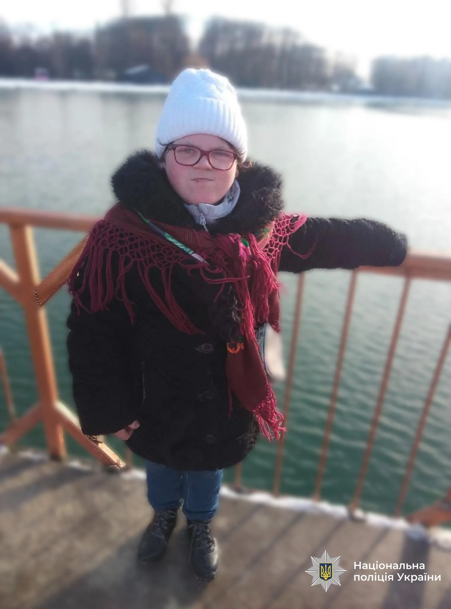 Була одягнена: у білу куртку, сіру шапку, сині джинсові штани та чорні кросівки.