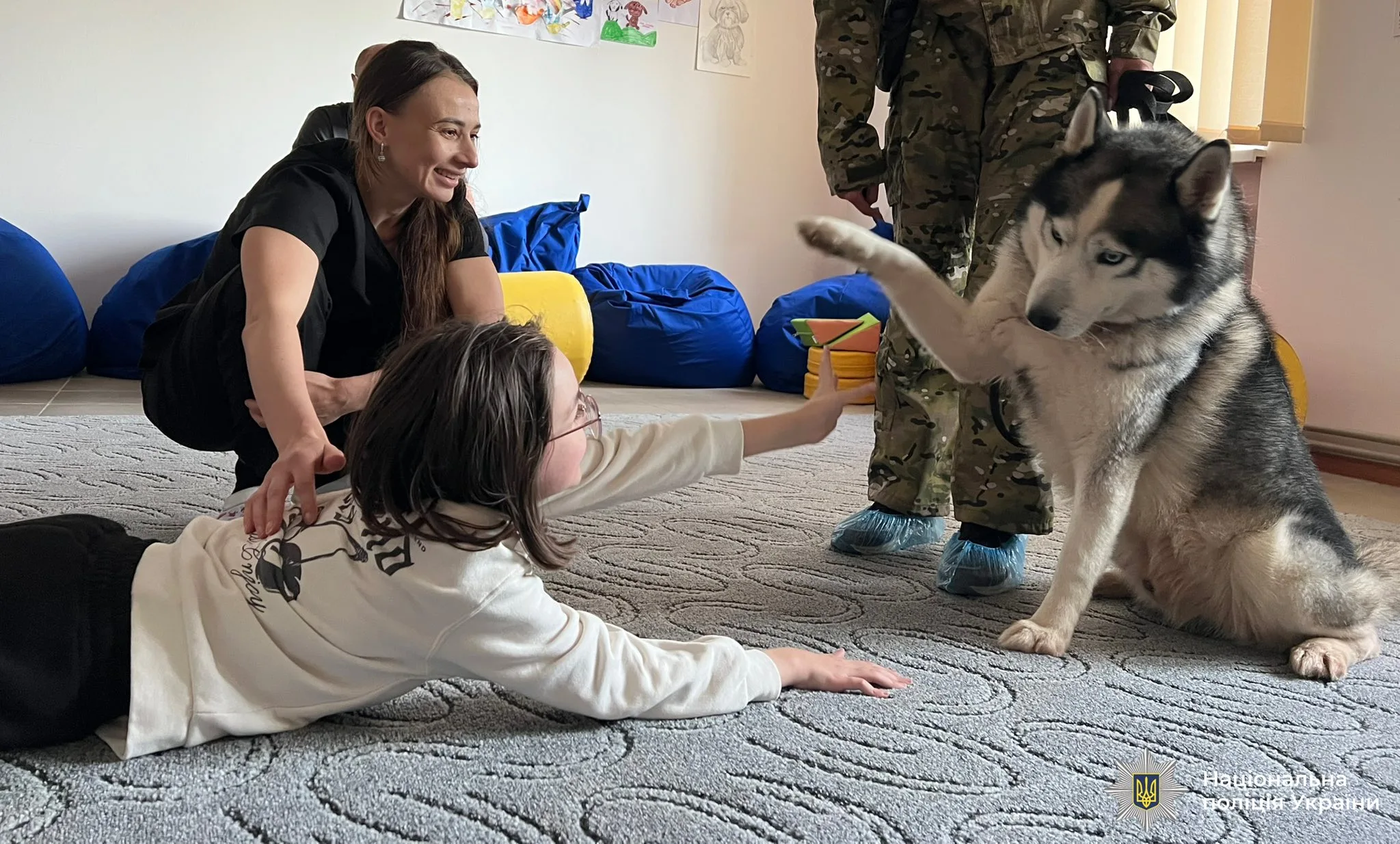 Для дітей правоохоронці організували заняття з елементами каністерапії — лікувально-реабілітаційної методики за участю собак.