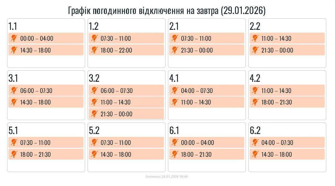 Завтра, 29 січня, в усіх регіонах України, в тому числі на Прикарпатті, будуть застосовуватися графіки погодинних вимкнень.